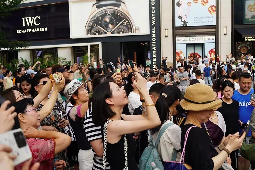自亮相起,上海吳江路和石門一路交叉口就成了人潮匯聚的中心。盡管高溫肆虐,卻絲毫無法阻擋人們的腳步。6月29日傍晚,這里更是人山人海,道路被擠得水泄不通,人們紛紛舉起手機,記錄下與“巨輪”同框的瞬間。現場熱鬧非凡,不僅有游客自拍、合影,還有主播忙著直播帶貨,熱鬧程度堪比大型狂歡現場。