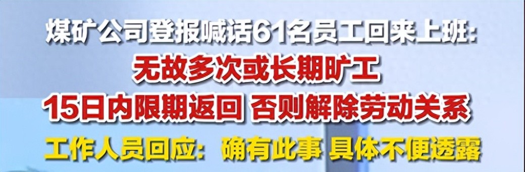 近日,甘肅靖煤能源有限公司王家山煤礦分公司一則要求 61 名曠工職工限期返崗否則解約的啟事。