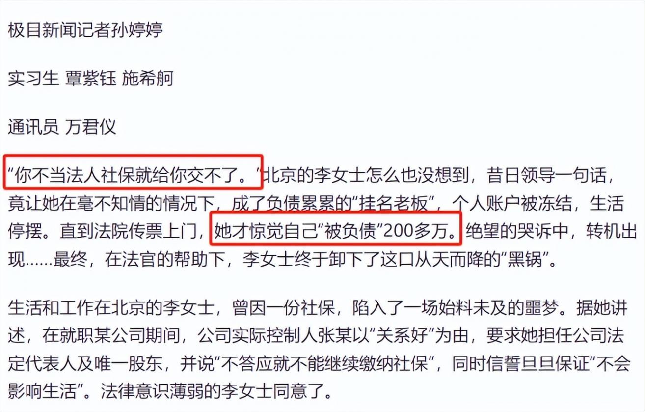 北京的李女士,入職公司之后,老板想要讓她“當法人”,讓她掛名擔任公司的法定代表人和唯一股東。