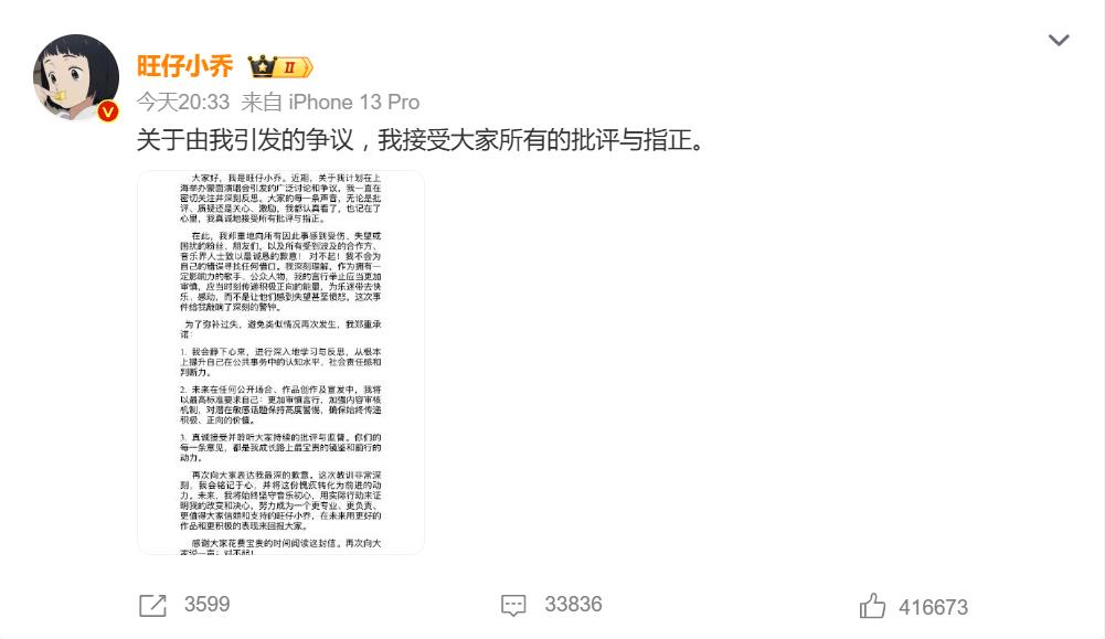 7月26日晚,歌手旺仔小喬針對近期爭議發布道歉信,卻因內容空洞、疑似AI生成再掀輿論風暴。這場因“蒙面演唱會”引發的連鎖反應,不僅暴露了其團隊公關能力的短板,更讓網友直呼:“敷衍到連抄模板都懶得改!”