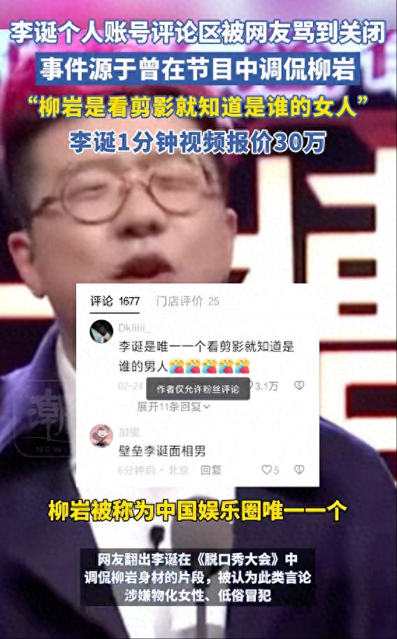 近日,知名脫口秀演員李誕個人賬號評論區被網友聲討致關閉,事件源于其曾在脫口秀節目中調侃女星柳巖。