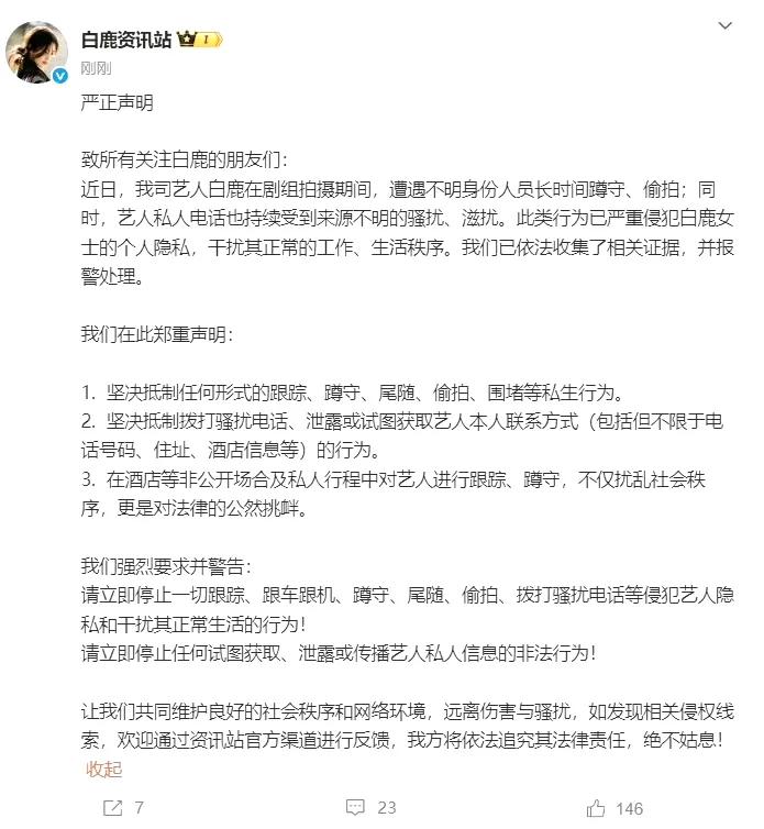 ss錄音發(fā)出后,輿論也迅速發(fā)酵,不少粉絲都為白鹿鳴不平,白鹿這邊也給出了公關(guān)回應(yīng):ss行為已嚴(yán)重侵犯白鹿女士的個(gè)人隱私,已依法收集了相關(guān)證據(jù),并報(bào)警處理。