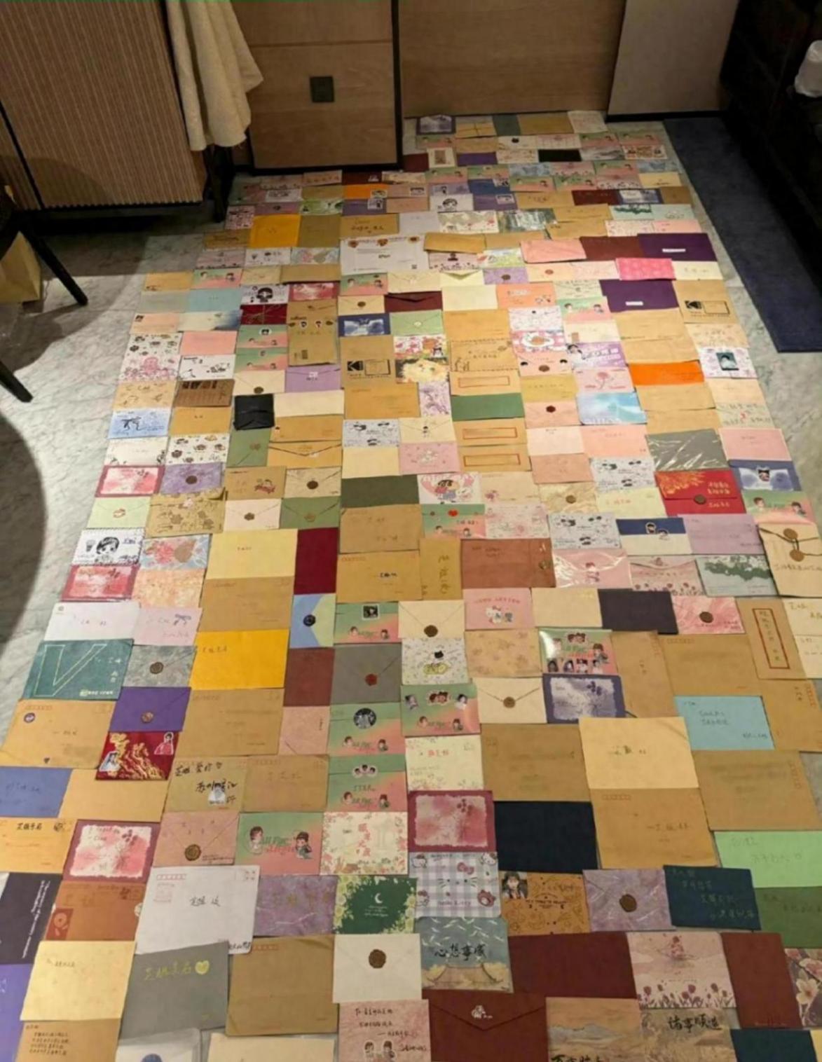 各式各樣的信封承載著跨越年代的心意:精致復古信紙上印著淡雅蘭梅,稚嫩筆觸繪制的白娘子卡通畫像,甚至還有貼著泛黃老照片的信封——那是粉絲珍藏數十年的合影。