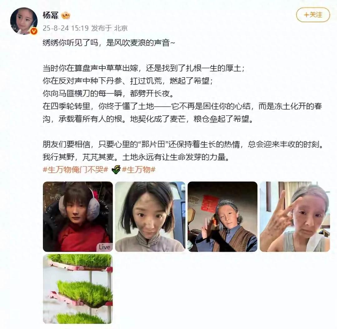 楊冪這次演的寧繡繡,是天牛廟村首富的女兒。這角色跟她以前太不一樣。去年她演了《哈爾濱一九四四》《狐妖小紅娘·月紅篇》,角色要么颯爽要么靈動,這次直接成了農婦。為了這角色,她算是下了血本。素顏出鏡,一點明星架子沒有,還特意增重5公斤,就為了演好那些高強度的農活戲份。預告一出來,#楊冪寧繡繡第一章天崩開局# 就沖上熱搜,她自己轉發定檔預告說“只要往下扎根,就有向上生長的力量!” 那股子拼勁,看得人佩服。