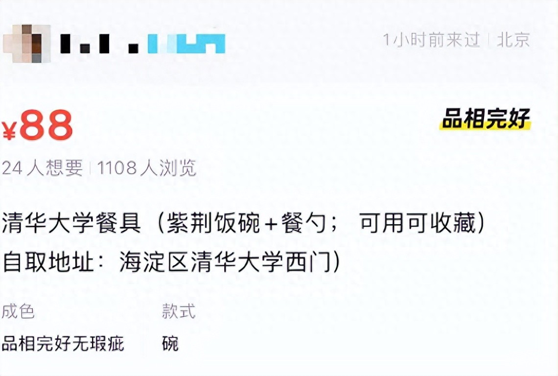 據上游新聞報道,在二手平臺,一套帶有“輕微使用痕跡”的紫荊色飯碗與綠色餐勺組合被定價88元。賣家在商品詳情圖介紹:“清華大學的紫荊色飯碗,買都買不到的,能用它吃飯感覺是不是會不一樣。”