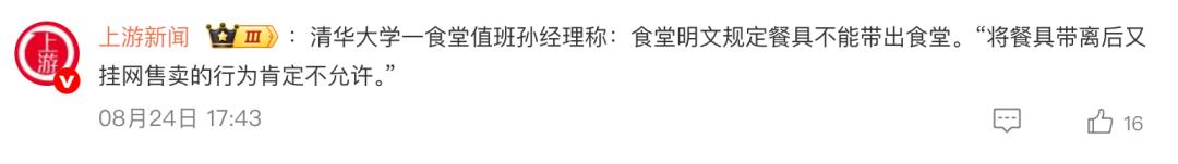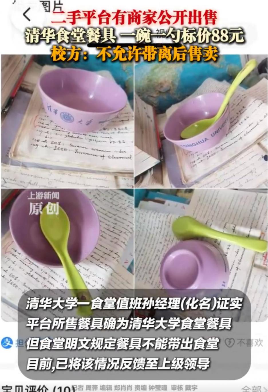 對此,清華大學一食堂值班證實,二手平臺所售餐具確為清華大學食堂使用的正規餐具。食堂明文規定餐具不能帶出食堂,“將餐具帶離后又掛網售賣的行為肯定不允許。”食堂已將該情況反饋至上級領導及保衛處,后續將跟進處理。