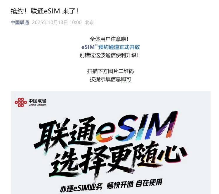 10月13日早上10點,中國聯通公眾號宣布eSIM預約通道正式開放,看樣子國行蘋果iPhone Air離消費者更近一步了。