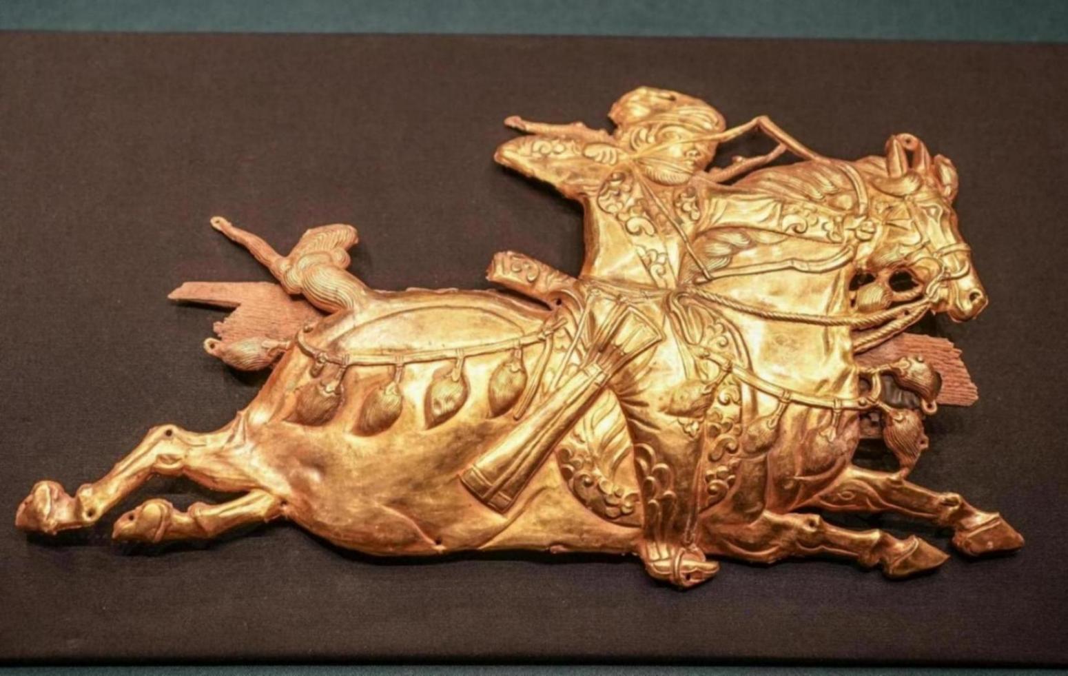 展廳里的一件騎射武士形飾牌被單獨(dú)安在玻璃柜里,能看出策展上做了重點(diǎn)處理。飾牌上的人像很有動(dòng)作感:頭上纏著巾布,眼睛突出,嘴下有濃密的絡(luò)腮胡,雙手正拉弓,像是馬上要開箭。專家把它的風(fēng)格追溯到西亞的薩珊王朝,但衣著又帶著吐蕃的味道,這種混雜本身就是一條線索——藝術(shù)樣式和圖像從西亞擴(kuò)散到更遠(yuǎn)的地方,有的地方吸收了本地元素,變成新的樣子。