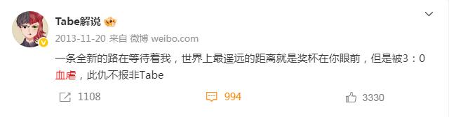 2013年,Tabe作為選手輸給SKT(T1前身)立下報(bào)仇誓言。Tabe微博截圖