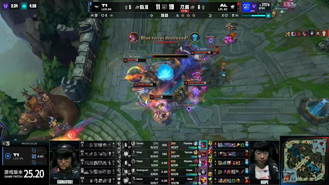 第四局,AL的陣容輸出不足,特別是ADC(物理輸出核心位)選手HOPE前期劣勢(shì)裝備落后,導(dǎo)致AL全隊(duì)的輸出能力不如對(duì)手,被T1將比分扳平。